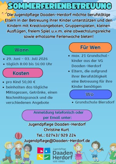 Die Jugendpflege Daaden-Herdorf möchte berufstätige Eltern in der Betreuung ihrer Kinder unterstützen und bietet deshalb auch in diesem Jahr in der ersten Sommerferienwoche ein ganztägiges Betreuungsangebot an. Von Montag, den 29. Juni bis Freitag, den 03. Juli wird den Kinder von 8.00 bis 16.00 Uhr ein abwechslungsreiches Programm mit kreativen, aber auch sportlichen Aktivitäten und Ausflügen geboten.