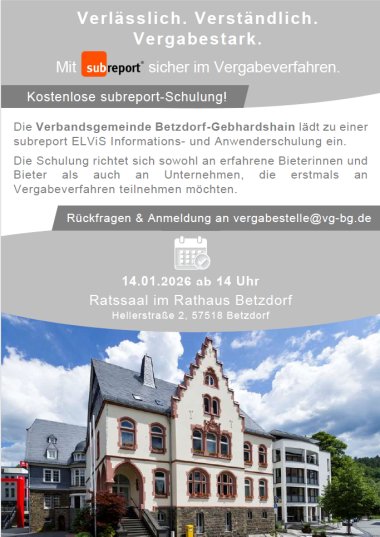 Um Ihnen den Zugang zu öffentlichen Aufträgen möglichst transparent, praxisnah und anwenderfreundlich zu gestalten, bieten die Verbandsgemeinde Betzdorf-Gebhardshain eine kostenfreie Schulung zum Vergabeportal „subreport ELViS“ an.