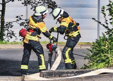 Erste Aufgabe für die Abnahme der Stufe Bronze war der Aufbau eines Löscheinsatz mit Wasserentnahme aus einem Unterflurhydranten. Über einen Verteiler lieferten anschließend 3 Strahlrohre Wasser, um die aufgestellten Metallklappen mittels Wasserstrahls umzulegen. Alle Teams hatten für den Aufbau nur knappe fünfeinhalb Minuten Zeit.