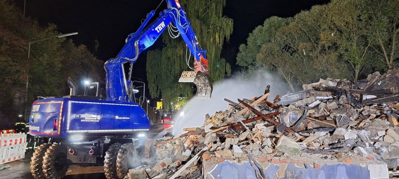 Das Gebäude stand nach dem Einsturz in Flammen, so dass in mehreren Einsatzabschnitten die Brandbekämpfung eingeleitet wurde. Im weiteren Einsatzverlauf übernahm das THW das Ausleuchten der Einsatzstelle sowie das Auseinanderziehen der Trümmerteile mittels Bagger.